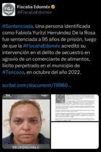 La Fiscalía del Estado de México logró que fuera sentenciada Fabiola Yuritzi Hernández De la Rosa a 95 años de prisión, luego de que la #FiscalíaEdoméx acreditó su intervención en el delito de secuestro en agravio de un comerciante de alimentos, ilícito perpetrado en el municipio de #Texcoco, en octubre del año 2022.