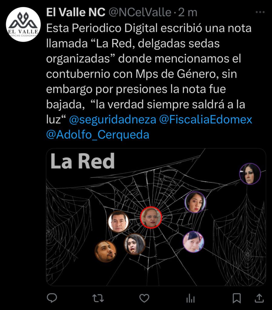 Tiempo atrás el Valle Noticias Ciudadanas  Publicó una nota llamándola LA RED delgadas sedas organizadas, donde menciona que no solo ella podría estar vinculada con este delito sino muchos más con autoridades de la Fiscalía General de Justicia del Estado de México y en específico de la Fiscalía de Género, sedes Nezahualcóyotl y Chimalhuacán.